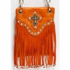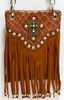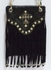 Fringe crossbody bag with faux leather body, beaded and embroidered flap, braided strap, magnetic closure, available in assorted colors.