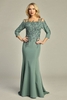 Mother of the bride sheath dress 3Q sleeve, illusion neckline, embroidered with beads and sequins, jersey fabric, sizes S–3XL Missy, labeled.