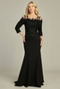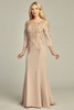 This mother-of-the-bride sheath dress features three-quarter length sleeves and an illusion neckline, embellished with embroidered floral detailing, sequins, and beadwork. The bodice is semi-structured, offering coverage while maintaining elegance. Made from jersey fabric, the dress provides stretch and comfort with a smooth drape suitable for formal occasions.