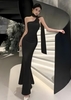 One shoulder maxi dress: Ivory full‑length dress with asymmetric neckline, shoulder tie, and 3D rose accent; fitted bodice, single unit.