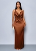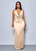 Plunge maxi dress: Beige satin full‑length dress with cowl neckline, deep plunge front, and strappy open back; draped fit, single unit.
