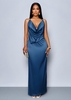 The Beige Satin Cowl Plunge Maxi Dress With Strappy Back is a formal full‑length gown crafted from smooth satin fabric, designed to accentuate fluid drape and surface shine. The front features a deep plunge neckline with a soft cowl overlay that creates volume and movement, while maintaining coverage through layered fabric structure. The bodice is lightly fitted with a bias‑cut silhouette that falls into a gently flared maxi skirt.