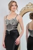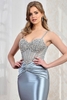 This sleeveless beaded illusion top satin sheath dress features a structured bodice with an ornate jewel detail across the neckline and chest, supported by slender shoulder straps. The sheer mesh paneling on the upper torso adds definition, while vertical seaming enhances visual structure. A ruched pleat design at the hip creates a gathered focal point, transitioning into a smooth, floor-length silhouette.
