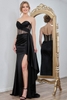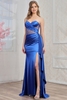 Sweetheart neckline dress features premium satin fabric combined with sheer mesh panels and rhinestone detailing, designed to create a striking and elegant visual effect. The dress is constructed in a full-length sheath silhouette, offering a sleek, body-contouring fit that enhances and elongates the figure. The bodice incorporates a pleated design across the bust and waist for added texture and sculpted shaping.