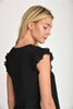 The Evy blouse is constructed from lightweight polyester and is designed in black color. This blouse offers a smooth finish suitable for daily wear. It features a V-neckline with a partial button-down front and subtle fringe-type ruffle cap sleeves for breathability and styling. A back elastic waistband provides flexibility in fit.