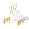 Skirt hangers 17" clear lucite with gold, matte gold, and matte silver swivel hook, metal clips; 40 per case in 10 retail packs.