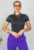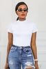 Mock neck bodysuit: 96% polyester, 4% spandex; short sleeves; double-layered; available in sizes S–L.