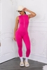 Snatched jumpsuit featuring mineral-washed cotton blend, front metal half-zip, available in S–L sizes, offered in Black, Pink, Orange, and Green.