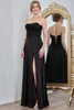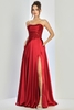 Strapless satin dress sweetheart cowl neck, smooth satin fabric, fitted silhouette, back zipper closure, individually packed for retail distribution.