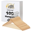 These ultra-slim wooden suit hangers are constructed from solid wood and measure 16.5 inches in length. Designed with a slim profile, each hanger includes a gold-tone swivel hook that rotates 360 degrees for easy access. Integrated shoulder notches ensure secure garment placement, and the wood pant bar accommodates trousers without slipping.