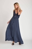 The Betty Maxi Dress by Muche & Muchette is constructed from 100% polyester, offering a smooth texture and fluid drape. It features a Grecian plunge V-neckline that transitions into a layered bodice, enhancing its visual appeal. The dress is designed in a one-size format, accommodating sizes 0 through 12. Available color options include Navy and Army Green. Care instructions recommend washing in cold water.