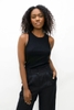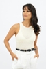 Round Neck Knitted Racer Tank Top made from stretch viscose blend, racerback cut with high neckline, fitted silhouette, porcelain color, machine washable, individually packaged.